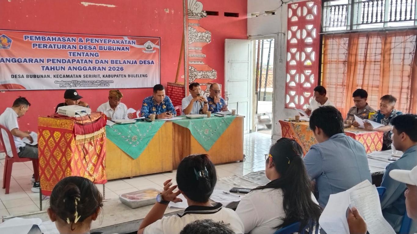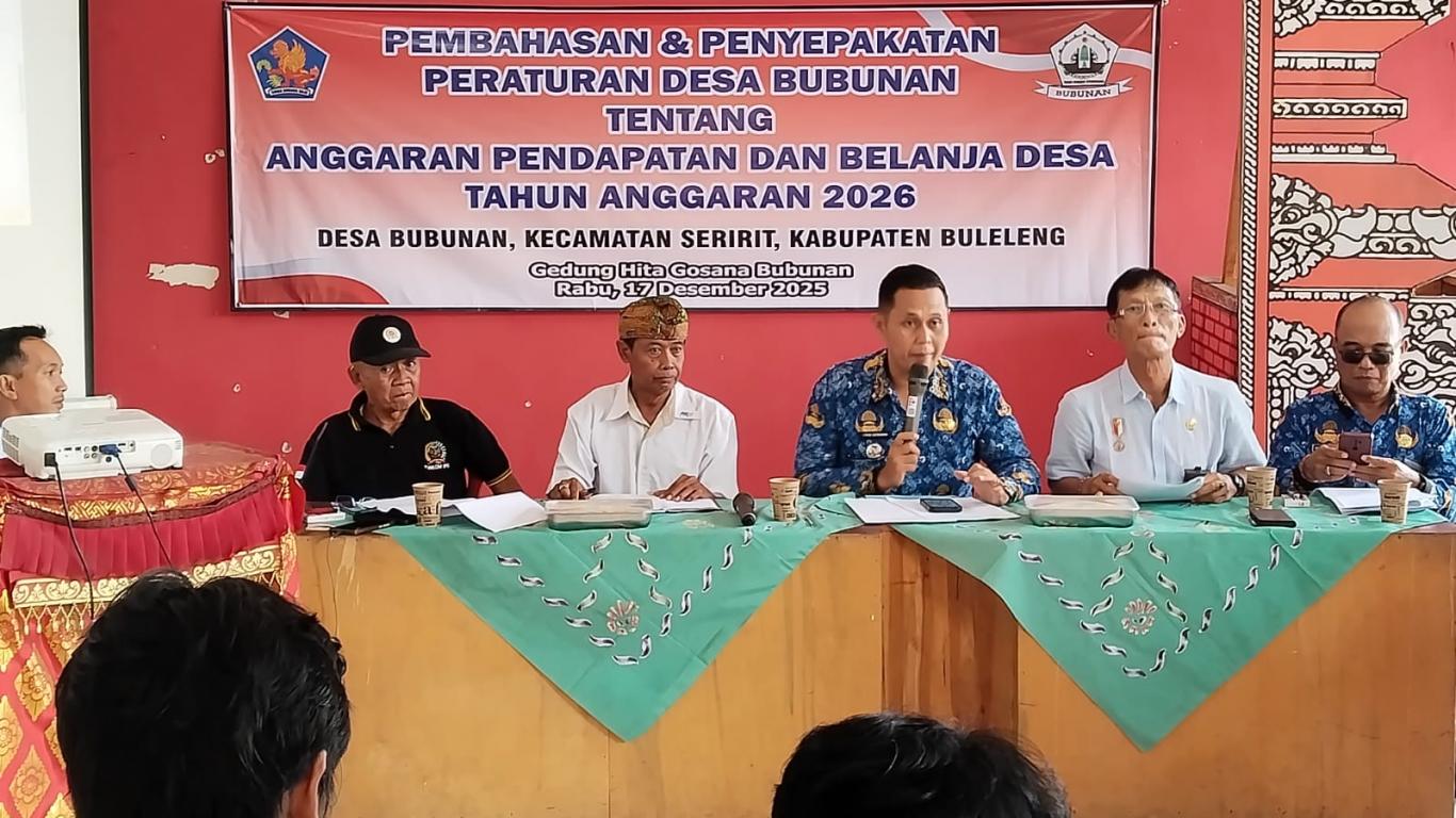 Bertempat di Gedung Hita Gosana Desa Bubunan, pada hari Rabu, 17 Desember 2025 dilaksanakan Rapat Pembahasan dan Penyepakatan Peraturan Desa Bubunan Tentang Anggaran Pendapatan dan Belanja Desa Tahun Anggaran 2026. Rapat dihadiri oleh Camat Seririt didampingi Kasi Pemerintahan Kecamatan, Perbekel Bubunan, Staf Pemerintahan Desa, Bendesa Adat, BPD dan anggota, Ketua LPM, Ketua TP PKK, Ketua Karang Taruna, Ketua PHDI Desa, Kepala TK,Kader Posyandu, Para Kepala Kelompok, Ketua dan Pengurus Koperasi Desa Merah Putih, Mahasisa Undiksa ( Tim Lomba Inovasi Pengelolaan Sampah Desa), KPM Desa, Babhinkamtibmas, serta Koordinator Linmas Desa Bubunan.
